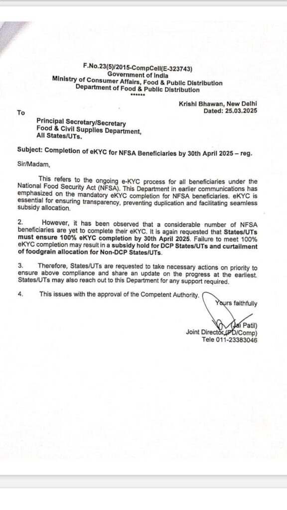 विषय: एनएफएसए लाभार्थियों के लिए 30 अप्रैल 2025 तक ईकेवाईसी पूरा करने के संबंध में।